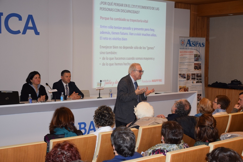 La viceresidenta de ASPAS, María José Andrade, y el director de Mapfre Santiago Hórreo, Fernando Luis Blanco, inauguraron el acto y dieron paso, en primer lugar, a Gonzalo Berzosa, que apuntó que la esperanza de vida de las personas con discapacidad ahora es mayor, y el reto está en vivir bien esos años. Según afirmó en su intervención, en la que muchos familiares asistentes se vieron reflejados en los ejemplos que citó, la garantía de envejecer bien depende de la capacidad de adaptación a los cambios que se producen.